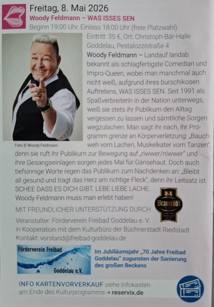 Karten sind nur noch über den Förderverein Freibad Goddelau e.V. oder das Kulturbüro der Stadt Riedstadt erhältlich!